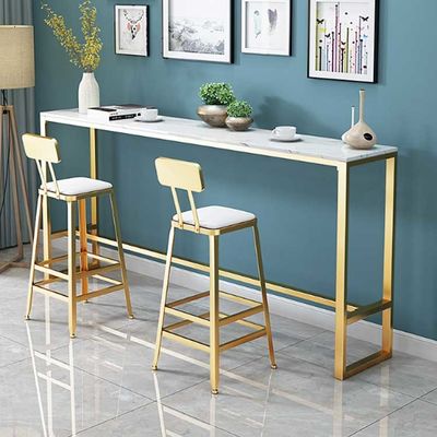 2. The centerpiece of this set is the bar table, featuring a white marble-patterned tabletop. The pristine white surface beautifully mimics the luxurious look of real marble, giving your space an air of elegance and refinement. The smooth and polished golden metal frame adds a touch of glamour and complements the marble pattern perfectly. With a length of 1.2 meters, this bar table provides ample space for drinks, snacks, or even small plates of food, making it ideal for socializing or enjoying a quick bite.